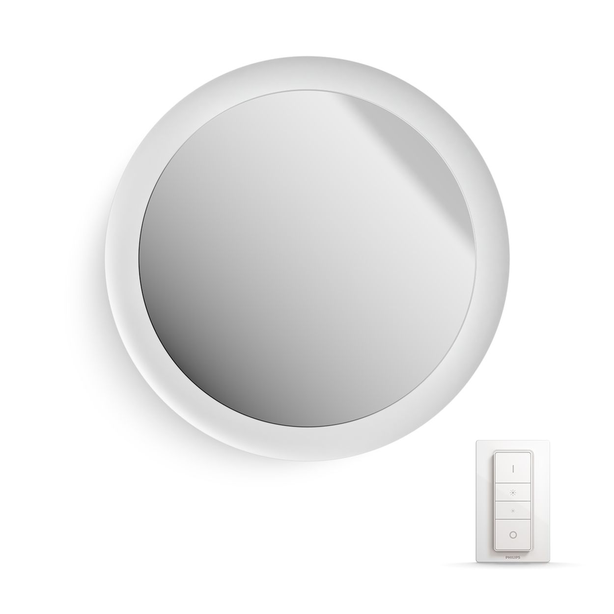 Make morning and evening routines that much better with the Adore lighted vanity mirror, a large round bathroom mirror encircled by a ring of warm-to-cool white light. Control with the included Hue dimmer switch or Bluetooth or connect to a Hue Bridge to unlock the full suite of features.