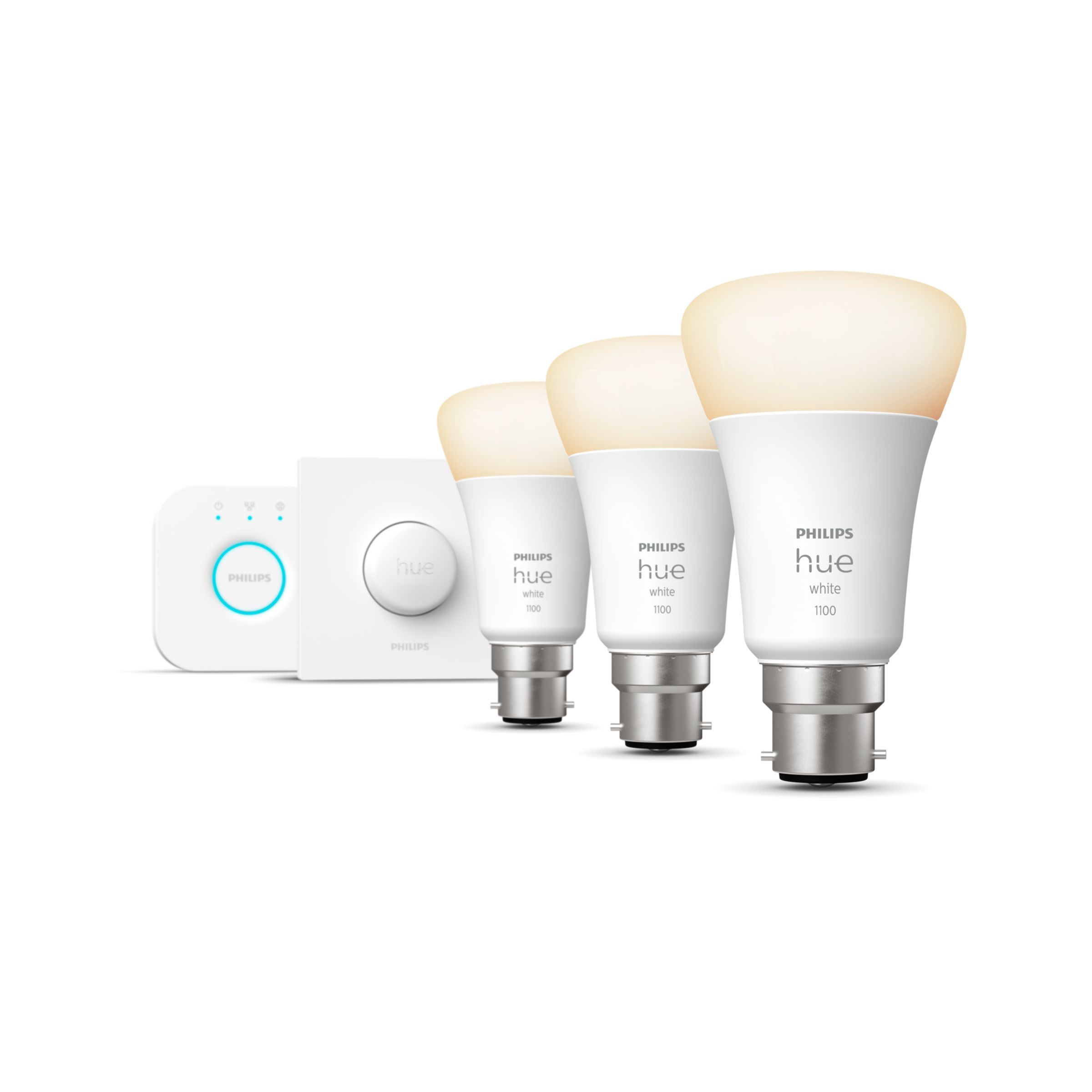 With three Philips Hue B22 smart bulbs that offer soft white light equivalent to traditional 75 W bulbs, one Hue Bridge, and one Hue smart button, you’ll have everything you need to add smart light throughout your home.