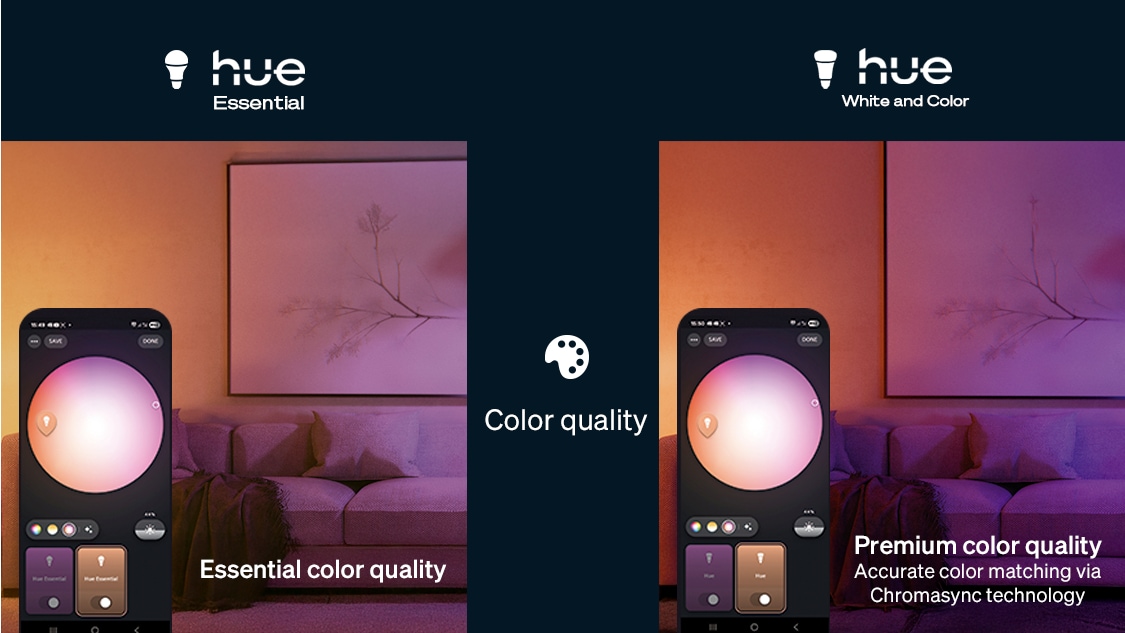 Hue Essential offers reliable color performance, with vibrant and steady tones for everyday use. But if you’re looking for premium color quality, the Hue range uses Chromasync technology for exceptional color consistency, with precision color matching and uniform brightness across multiple bulbs throughout your home.