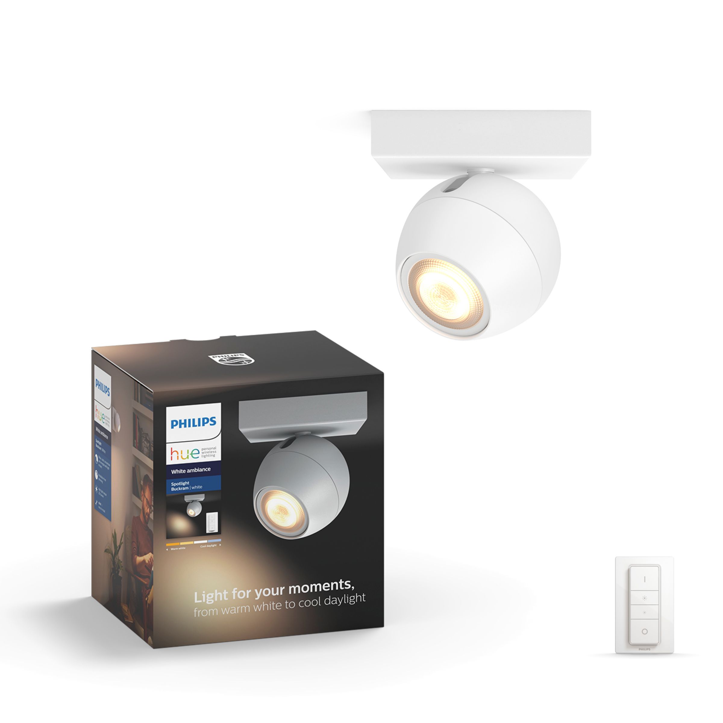 De Philips Hue white ambiance opbouwspot Buckram worden geleverd met een draadloze dimmer en een white ambiance GU10 LED-lamp die je helpt te ontspannen, lezen, concentreren en energie opdoen. Geniet van natuurlijk wit licht dat je kunt aanpassen aan je dagelijkse bezigheden.